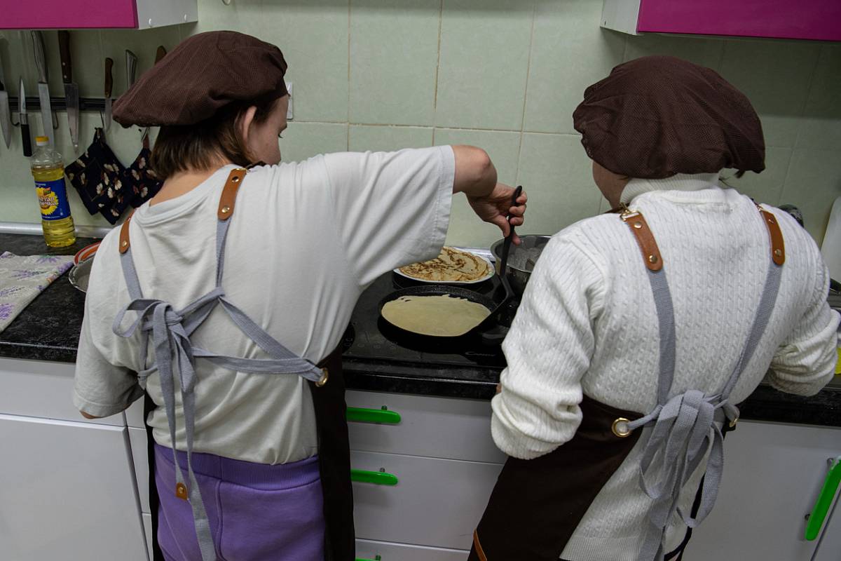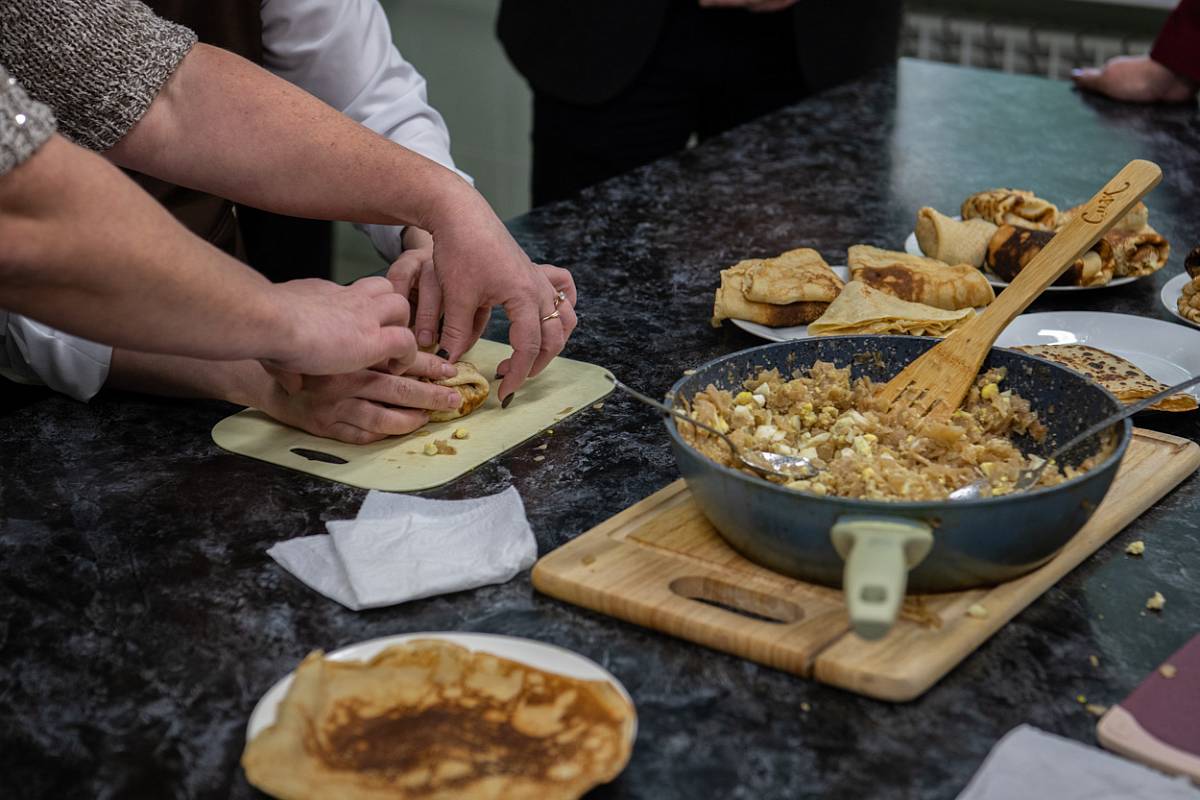 Когда на кухню заглянула Светлана Агапитова, там несколько человек увлеченно делали блины с капустой. Процесс был хорошо организован – двое у плиты жарили сами блинчики, а трое за столами заворачивали в них начинку.
