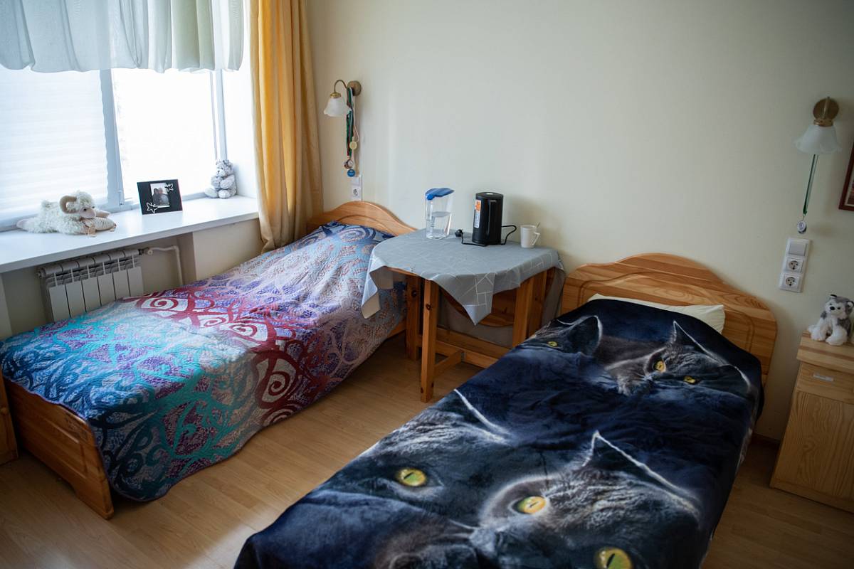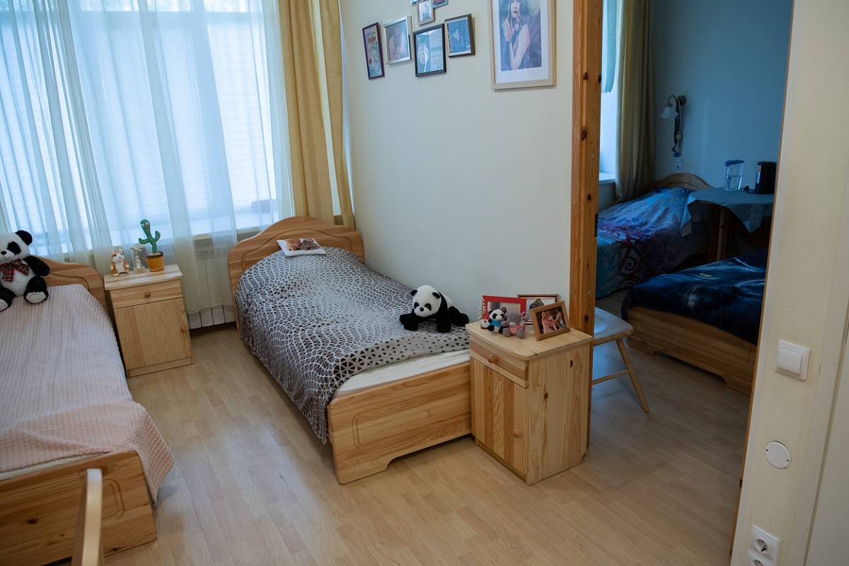 В отличие от ДСО «Покровский», здесь не пошли по пути создания тренировочной квартиры, а перепрофилировали для этого один из корпусов. В нем проживают 28 участников программы подготовки к сопровождаемому проживанию, которая рассчитана на три года. Отбирали в нее по принципу «кто хочет и может». В корпусе убрали традиционный медицинский пост, чтобы не было атмосферы больницы. Обстановку постарались сделать максимально домашней, используя для декора то, что создают проживающие на арт-терапии. В этом нашли и дополнительный стимул для занятий творчеством – делать что-то не для какой-то выставки, а распространить ощущение арт-пространства на все помещения центра. Собственно, создание уюта там, где ты живешь – уже элемент реабилитации.Малонаселенные комнаты с отдельными санузлами также способствуют «одомашниванию». Индивидуальное оформление интерьера это подчеркивает.
