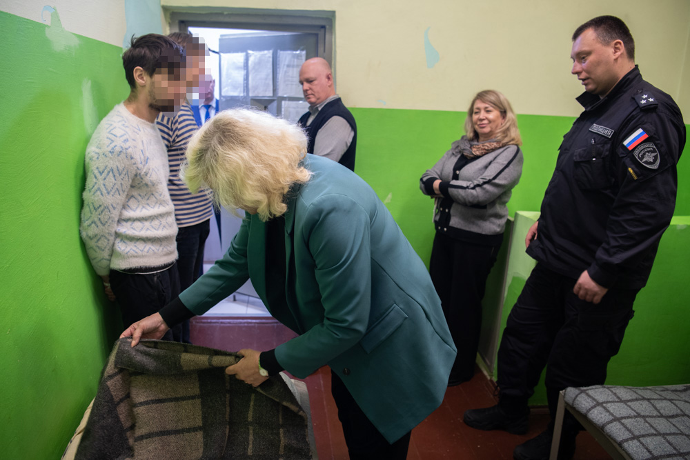 В Петроградском районе ИВС располагается на первом этаже здания Управления Министерства внутренних дел. В нем всего четыре камеры, рассчитанные на размещение 9 подстражных.В блок помещений изолятора петербургского Уполномоченного проводил Начальник УМВД Евгений Аргер. Состояние камер хорошее, установлена антивандальная сантехника. Обстановка, как и положено – спартанская, но есть все необходимое: металлические нары с деревянным настилом, столы, скамейки, полки для хранения вещей, железные тумбочки. Светлана Агапитова обратила внимание, что в камерах есть не только углубленные в стену светильники, но и потолочные, что заметно повышает уровень освещенности. Увидев, что у подстражных лежат открытые книги, она поинтересовалась– достаточно ли света для чтения? Молодые люди ответили, что даже при ночном освещении читают. Кстати, есть и небольшая библиотека – около 50 книг.