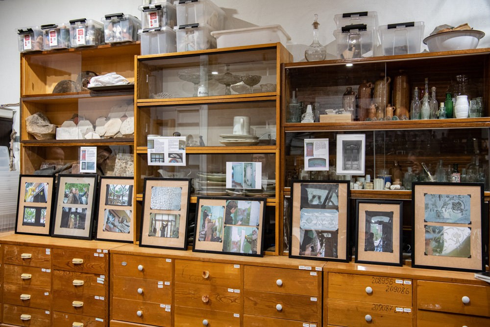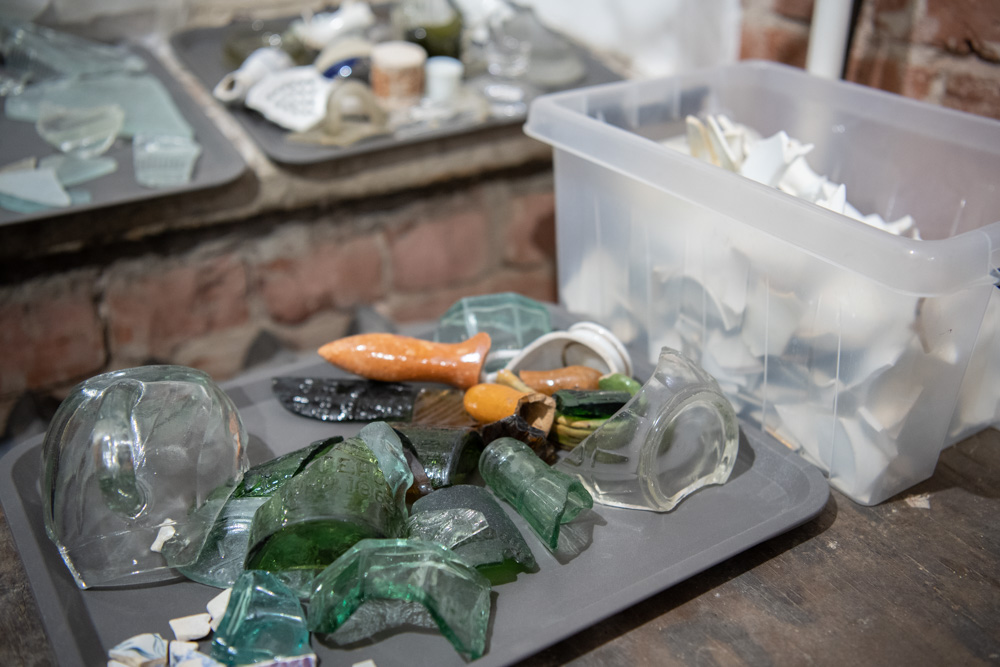 Показывая рукой на стеллажи с ящиками, где в аккуратном порядке разложены находки, создательница «Стеклянного городка» рассказала: «Мы собираем так называемый подъемный материал. Это то, что находим на берегу, не проводя раскопок. Все это найдено здесь».