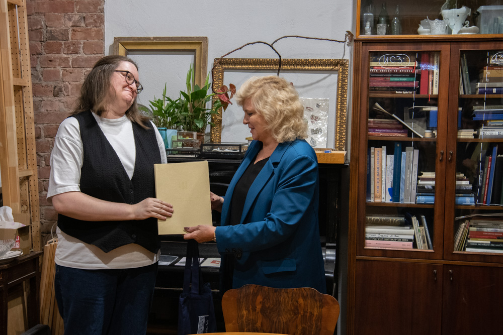 Участникам «очистительных акций» Светлана Агапитова вручила благодарности в помещении проекта «Стеклянный городок», который создала исследовательница и градозащитница Ника Артемьева (Виктория Полухина). Это место для торжественной встречи было выбрано неслучайно. Проект «Стеклянный городок» – это настоящая машина времени, собранная в буквальном смысле по осколкам. Его создательница уже несколько лет занимается поиском исторических артефактов на берегах Невы и других рек в районе бывшего Императорского стеклянного завода. Сотни найденных черепков посуды, фрагментов декора, керамики складываются в предметную летопись целого района, рассказывая о быте, ремёслах и жизни его обитателей.Перед церемонией Ника Артемьева провела для гостей небольшую экскурсию. «Это пространство появилось именно из-за того, что я занимаюсь историей района, где мы с вами находимся, – начала она. – Все знают про фарфоровые заводы, но мало кто слышал про стеклянные, кроме специалистов. Но все вы точно видели изделия Императорского стеклянного завода. Например, в Зимнем дворце… там есть, например, напольные стеклянные канделябры. Их делали здесь».
