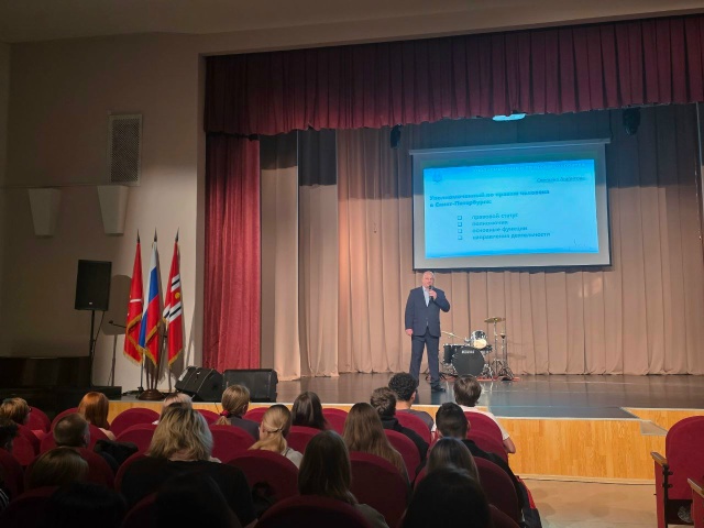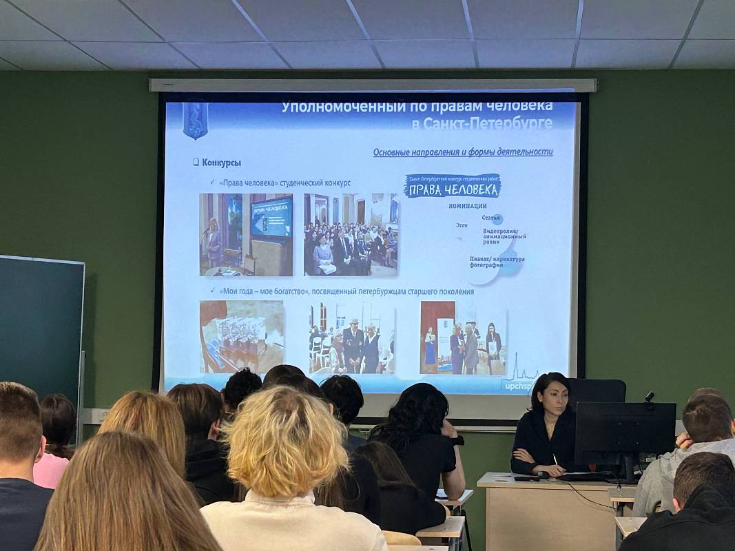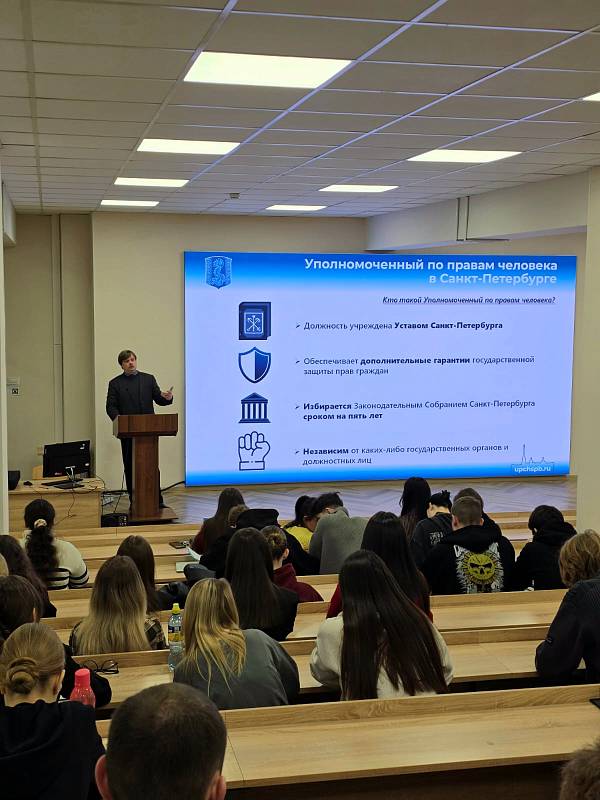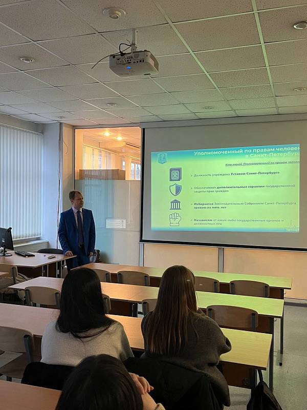 Представитель Уполномоченного ознакомил студентов с информацией о деятельности государственного правозащитного органа Санкт-Петербурга, рассказал о Конституции Российской Федерации, о конституционных правах и обязанностях граждан, ответил на вопросы студентов о работе аппарата и проектах Молодежного совета.