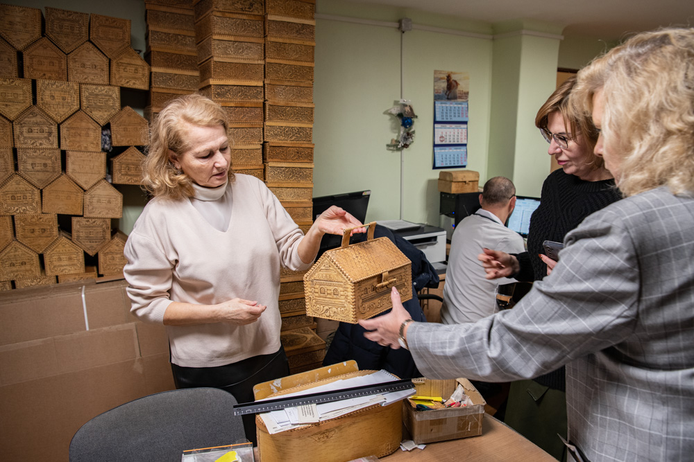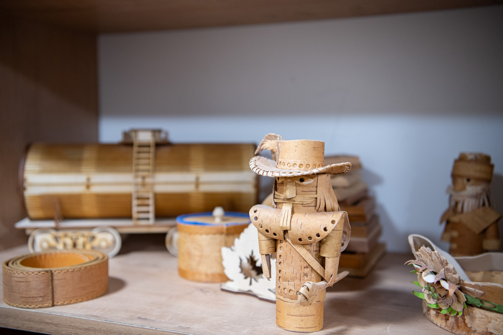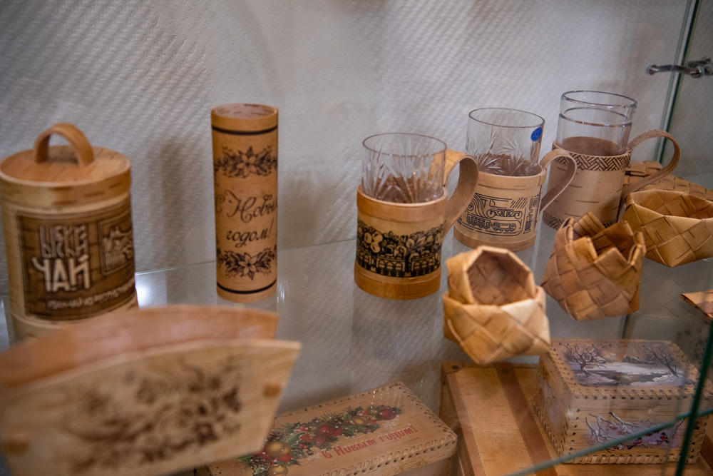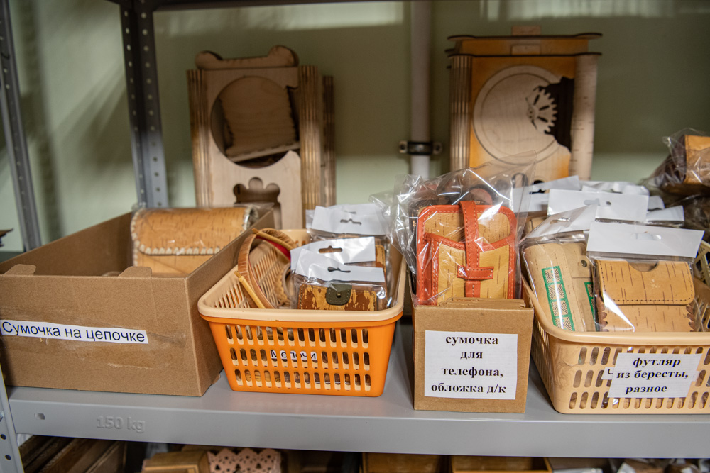 В ассортименте есть место и более традиционным изделиям народных художественных промыслов с практическим назначением: туеса разных размеров и форм, солонки, подставки, сухарницы, конфетницы, салфетницы, коробы для хранения хлеба.