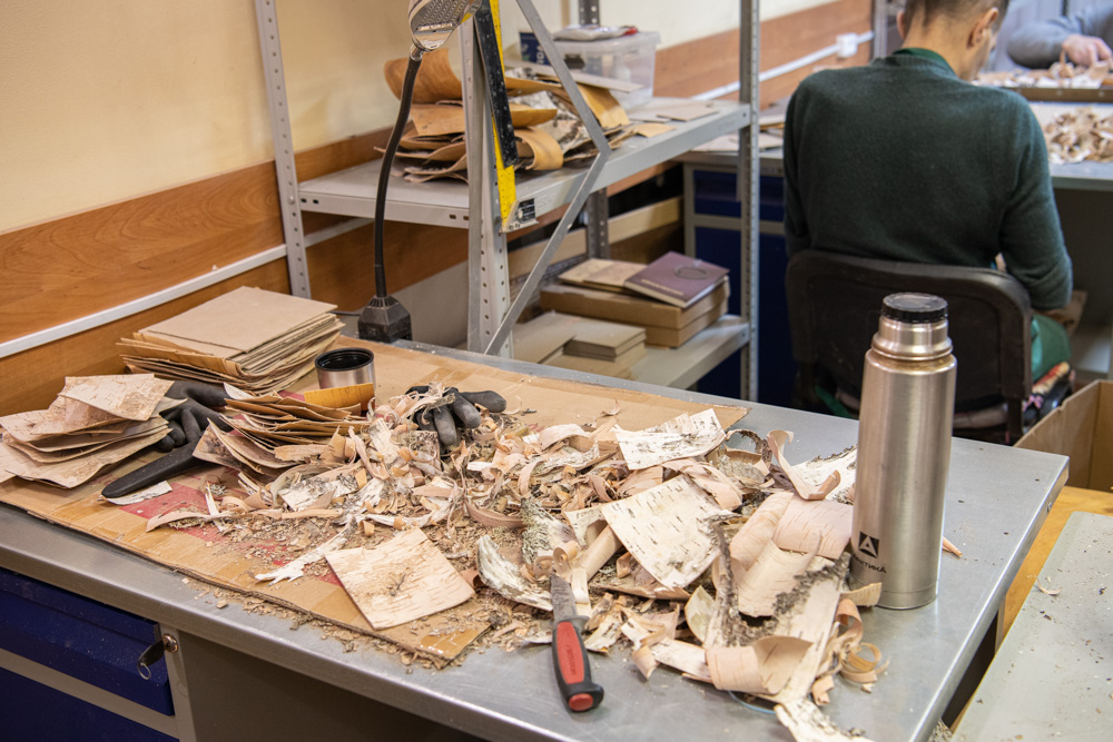После соответствующей подготовки, материал поступает в работу. В производственном процессе не применяются вредные вещества такие, как растворители или лаки. Изготовление сувениров из бересты разработано на основе ремесленных секретов, передавшихся из поколения в поколение на протяжении нескольких веков. Однако, и современные технологии тоже прекрасно уживаются с традиционным искусством под крышей творческой мастерской. Помимо ручного инструмента здесь используются компьютеры, плоттеры, устройства для нанесения рисунка. И все же, степень участия человека такова, что практически каждое изделие является в своем роде авторским и неповторимым.