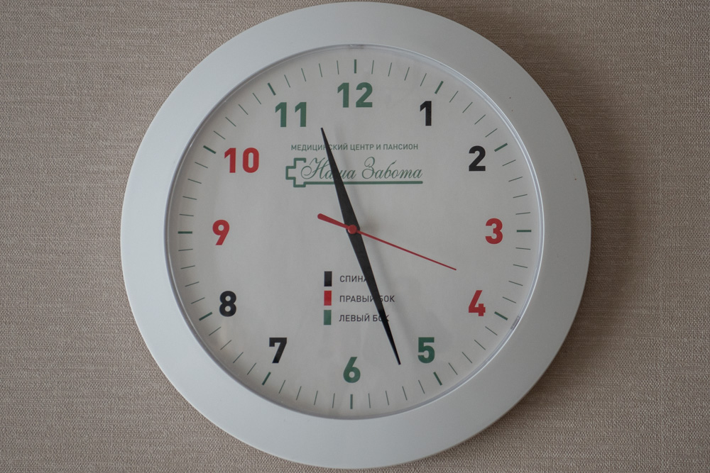 Заметила Светлана Агапитова в комнатах часы со специфическим циферблатом. Оказалось, что это своеобразная «антипролежневая» памятка для персонала – взглянув на них понятно в каком положении в данное время должен находиться лежачий подопечный.