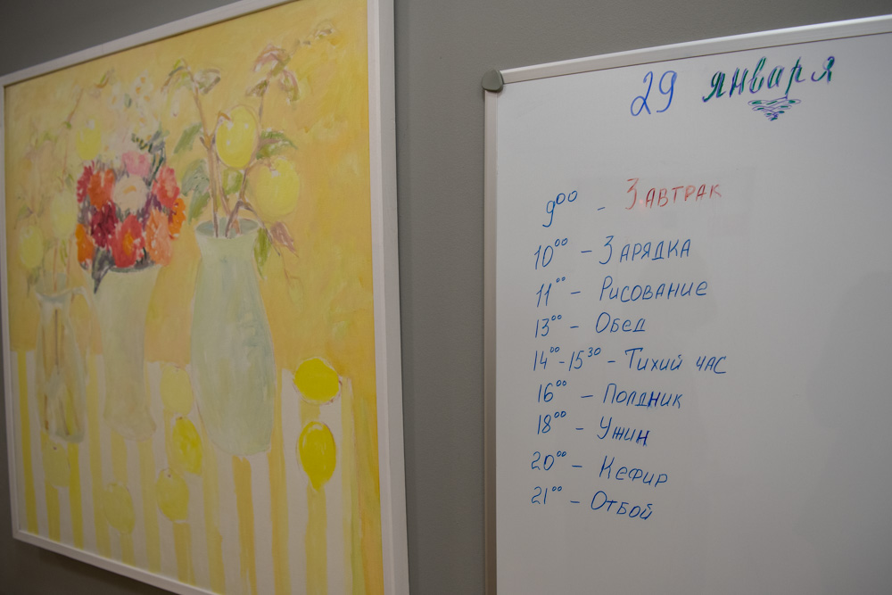 Питание здесь пятиразовое и составляет половину пунктов режима дня. Процедуры и реабилитационные занятия каждый делает по своему расписанию. Коллективно занимаются рисованием или читают стихи в качестве необходимой интеллектуальной нагрузки. Те проживающие, с которыми удалось побеседовать Светлане Агапитовой, отмечали качество питания и внимательное, бережное отношение персонала.