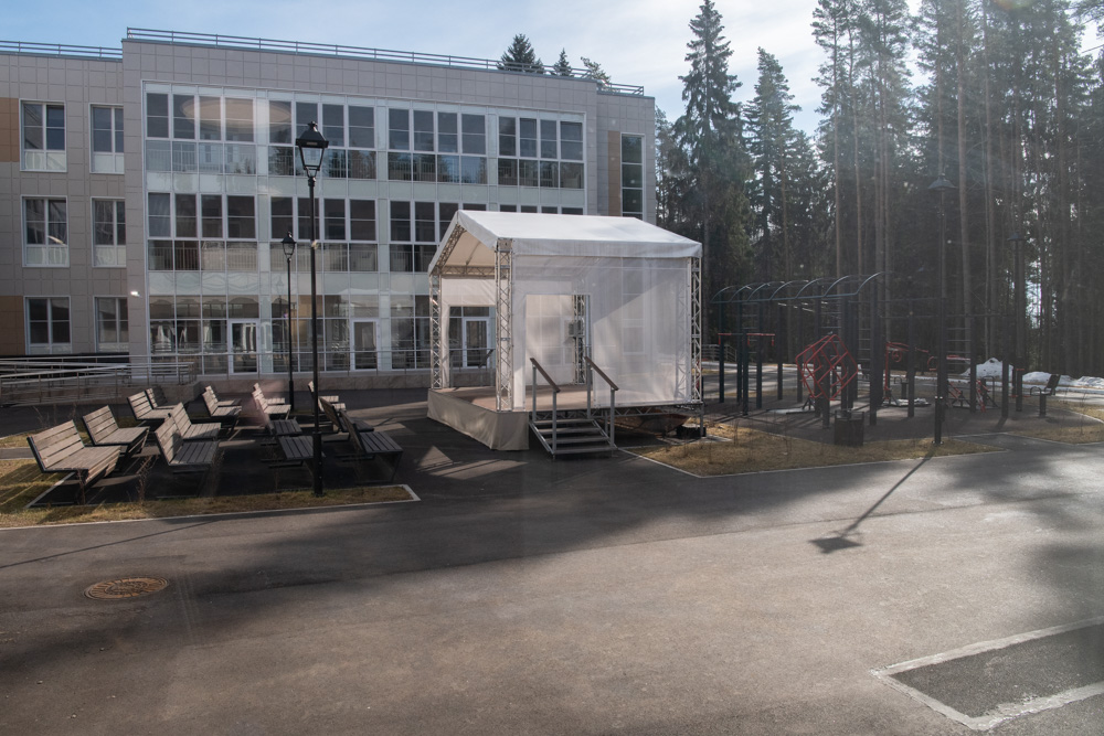 Во внутреннем дворике сделаны концертная и спортивная площадки. Перед сценой установлены скамейки, для зрителей. Впрочем, жилые комнаты расположены так, что желающие смогут наблюдать происходящее на открытой эстраде прямо из своих окон. Сторонники физической активности смогут поддерживать тонус на уличных тренажерах.