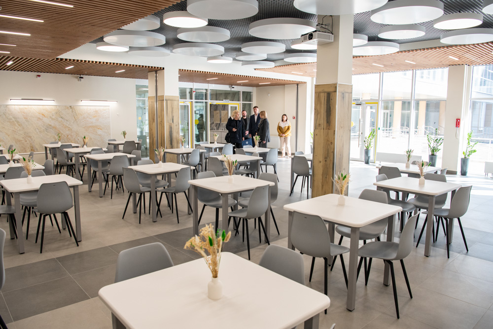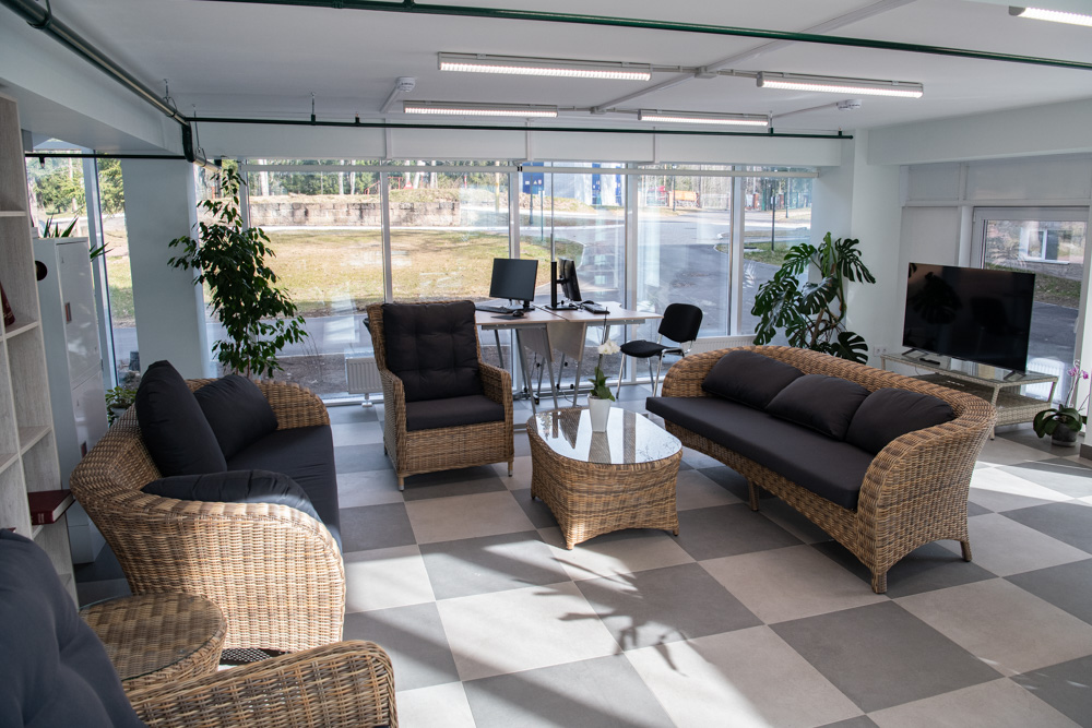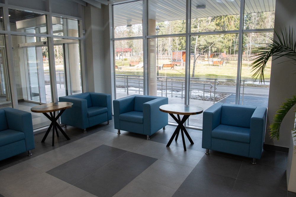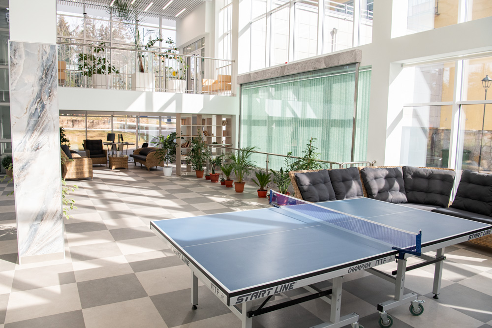 Впечатляет общественное пространство в холле первого этажа со стеклянными стенами. Оно разделено на зоны, в которых можно уютно устроиться с книжкой или, например, провести занятие литературного кружка, посмотреть в компании большой телевизор, расположившись на мягком диване. Можно поиграть в настольный теннис или трансформировать все пространство для коллективного просмотра кинофильма.