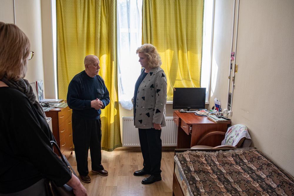Осмотрев новое здание, Светлана Агапитова прошла по «теплому» переходу в главный корпус, где сразу же встретилась с лауреатом IV фестиваля Уполномоченного по правам человека в Петербурге «Мои года — мое богатство» в номинации «Незаменимый» Виктором Спиридоновым. Радушно пригласив в свою комнату, Виктор Владимирович охотно поделился впечатлениями. Если не вдаваться в подробности, то после гибели жены и выезда из района боевых действий, он был в бедственном состоянии – как моральном, так и физическом, и считает, что здесь его просто вернули к жизни заботой и хорошим отношением.