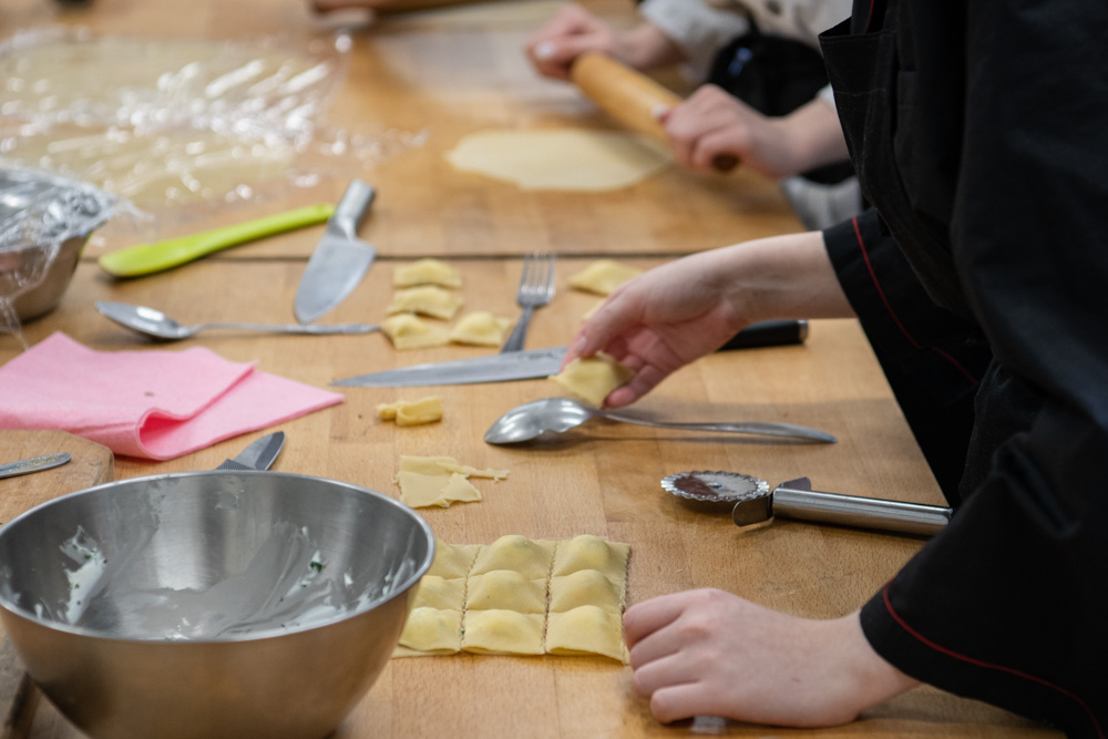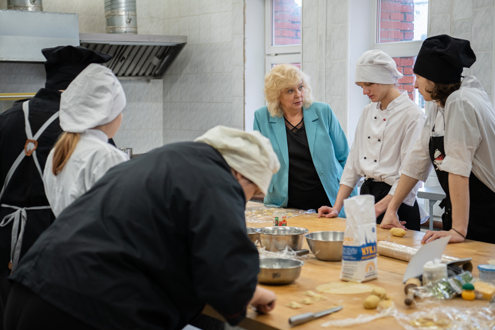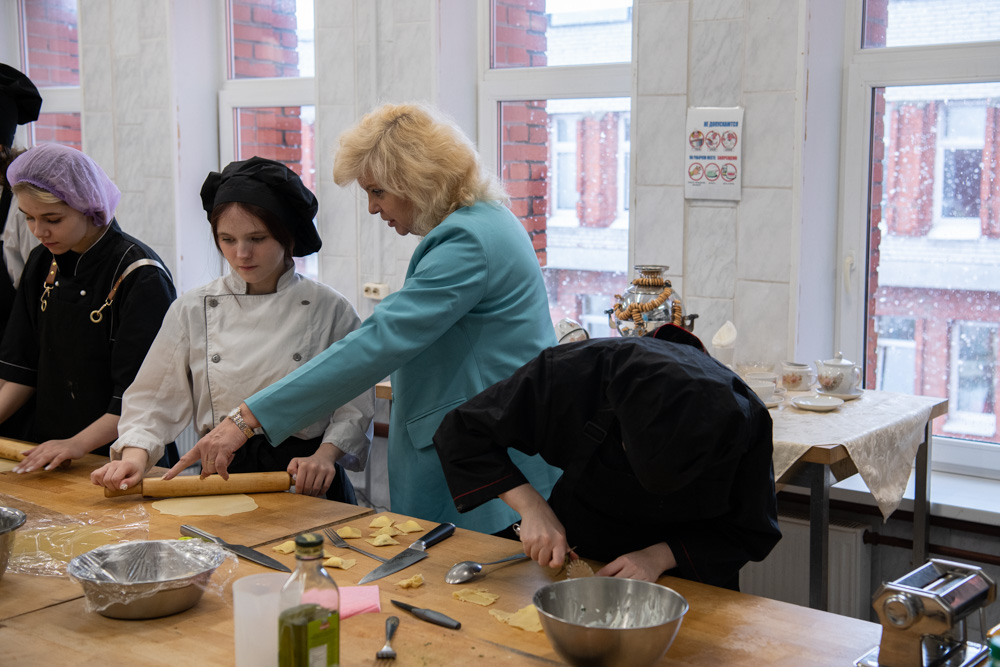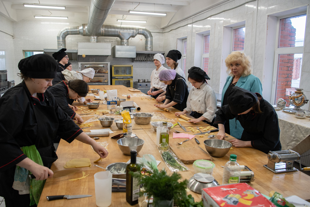 Побывала Светлана Агапитова и на учебных кухнях. Ребята увлеченно катали тесто и лепили равиоли. По сложившемуся порядку все приготовленное сами и съедают, но могут предложить и преподавателю, под чьим присмотром они готовили. Так что есть совершенно практический смысл стараться приготовить вкусно. На таких же кухнях проходят и выпускные экзамены – одной лишь теорией тут не отделаешься…