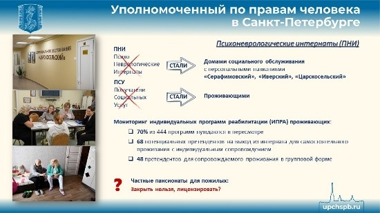 Мы неоднократно бывали во всех восьми психоневрологических интернатах Санкт-Петербурга, завершив в 2024 году большую работу по мониторингу индивидуальных программ реабилитации проживающих там дееспособных граждан трудоспособного возраста. В результате выяснилось, что из 444 программ более 70% нуждаются в пересмотре. Было выявлено 68 потенциальных претендентов на выход из интернатов с целью самостоятельного проживания с индивидуальным сопровождением и 48 претендентов для сопровождаемого проживания в групповой форме.