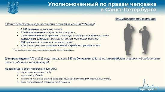 О срочной службе. В 2024 году мои сотрудники являлись членами призывных комиссий на территориях Адмиралтейского, Кировского, Петроградского и Фрунзенского районов Санкт-Петербурга.