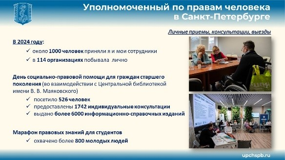 В 2024 году я и мои сотрудники приняли около 1000 человек. В офисе Уполномоченного, а также посещая различные городские учреждения и проводя там заранее анонсируемые приемы. Это помогает людям разрешать проблемы «на местах». Лично я в минувшем году побывала в 114 организациях.