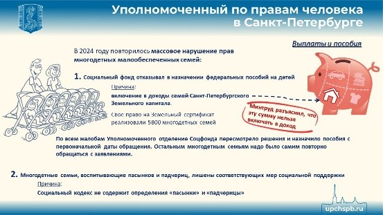 2024 год ознаменовался повторным нарушением прав многодетных семей на единое пособие из-за включения в доходы семей Санкт-Петербургского Земельного капитала. Отделение Социального фонда по Санкт-Петербургу и Ленинградской области вновь почему –то стало считать, что Земельный сертификат – это компенсационная выплата. В результате произошло массовое нарушение прав многодетных семей в СПб. Пришлось подключать Минтруд, которое разрешило в итоге наш спор, сказав, что эту сумму нельзя включать в доход. Но на это ушло несколько месяцев!