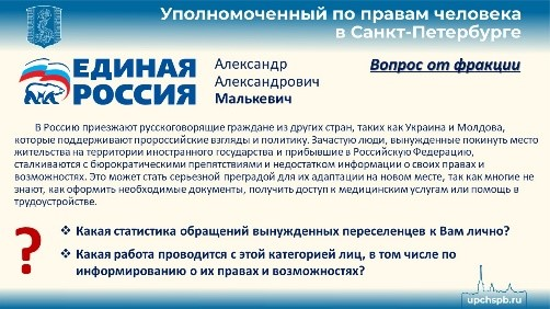 Всего пять обращений мы получили от приехавших в Санкт-Петербург граждан Украины, Молдовы, прибалтийских стран, которые просили о помощи. И это скорее свидетельствует, что миграционные органы и Комитет по межнациональным отношениям, которые ведут приемы таких граждан и размещают для них всю необходимую информацию, со своей задачей помощи, просвещения и маршрутизации в целом справляются. Но мы всегда готовы подключиться.