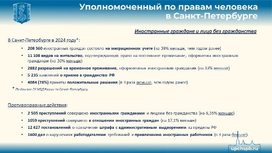По данным ГУ МВД России по Санкт-Петербургу, на миграционном учете в Санкт-Петербурге состояло 208 360 иностранных граждан, что на 39% меньше, чем годом ранее. Фиксируется заметное сокращение оформленных иностранным гражданам видов на жительство, подтверждающих право на постоянное проживание – на 30%. Аналогичным образом, в сопоставимых масштабах снизилось за год число оформленных иностранным гражданам разрешений на временное проживание – на 33%.