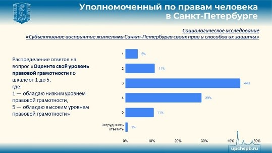 Согласно исследованию «Субъективное восприятие жителями Санкт-Петербурга своих прав и способов их защиты», которое в минувшем году по нашей просьбе провела клиника социологии СПбГУ, уровень информированности горожан в данной сфере крайне низкий. Выяснилось, что относительное большинство опрошенных петербуржцев самокритично оценивают собственный уровень правовой грамотности на оценку «удовлетворительно», тогда как на оценки «хорошо» и «отлично» - порядка 40% опрошенных. Напрашивается очевидный вывод (который озвучили и сами опрашиваемые) о необходимости систематического повышения уровня правовой грамотности жителей нашего города.