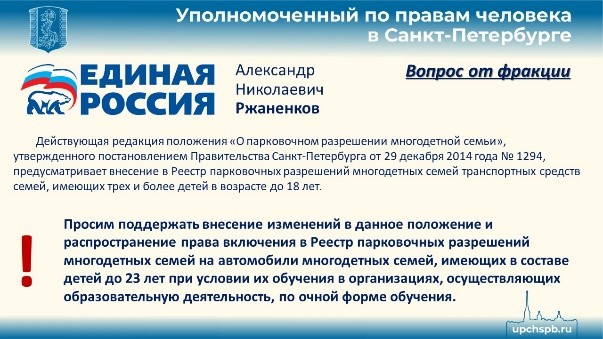 Не решенным остается вопрос, по которому ко мне обращаются многодетные семьи, воспитывающие пасынков и падчериц. Понятие «многодетная семья» в Социальном кодексе не содержит такого понятия. Я считаю, что это нарушает права этих семей на соответствующие меры социальной поддержки. Отсутствие в Указе Президента упоминания пасынков и падчериц не означает, что они не являются членами многодетной семьи. Об этом же говорит уже сложившаяся на территории Российской Федерации судебная практика. В комиссии Александра Николаевича Ржаненкова этот вопрос находится на рассмотрении.