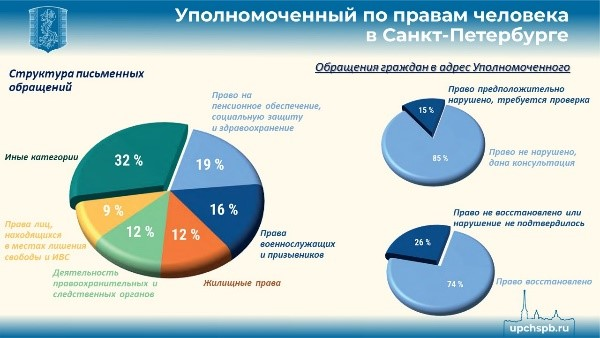 Анализ поступивших обращений, как и годом ранее, свидетельствует о том, что большая их часть — 85 % — обусловлена возникающими у граждан трудностями в понимании юридических аспектов реализации своих прав и обязанностей. В случаях, когда были выявлены признаки предполагаемого нарушения тех или иных прав, в 74 % ситуаций удалось их восстановить и оказать людям деятельную помощь.
