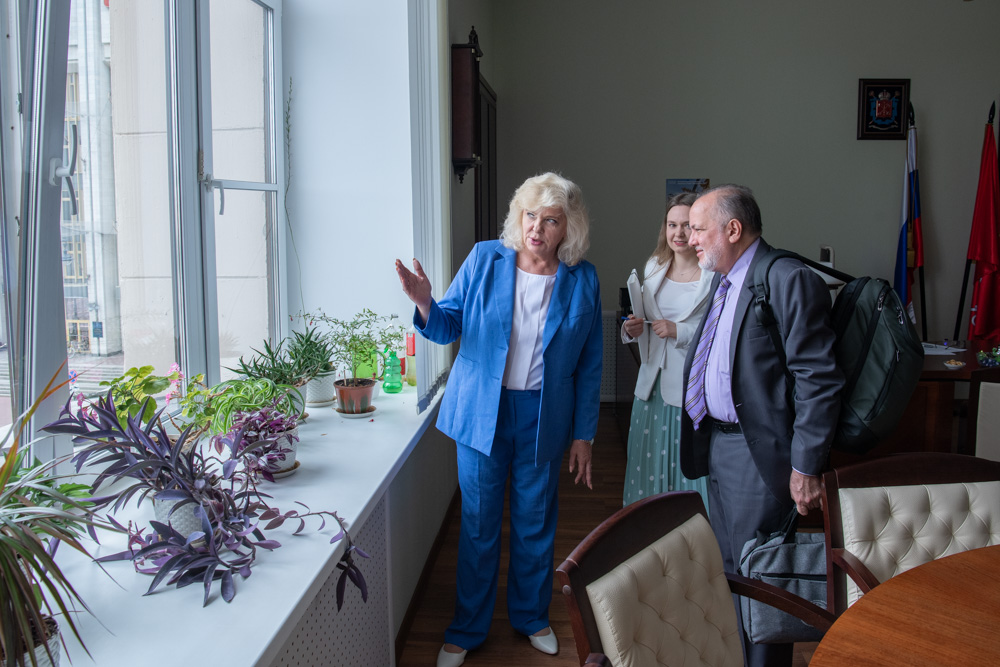 Собственно, встреча правозащитников и началась с объектов культурного наследия. Светлана Агапитова подвела Альфредо Руиса Ангуло к окну своего кабинета, откуда открывается прекрасный вид сразу на два памятника истории и культуры: на здание Смольного, возведенное в начале 19 века в стиле классицизма, где работает городское правительство, и на Смольный собор – православный храм в стиле елизаветинского барокко, строительство которого началось во второй половине 18 века и завершилось в тридцаты годы 19-го.